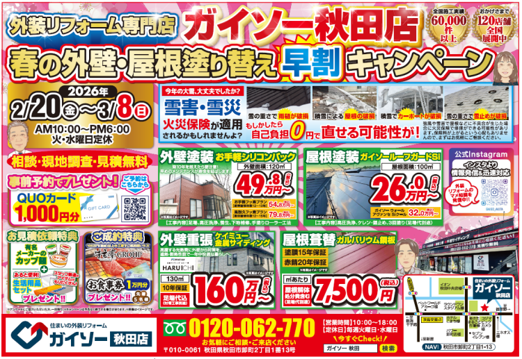 ガイソー秋田店では2026年春の外壁・屋根塗り替えキャンペーンを開催いたします。