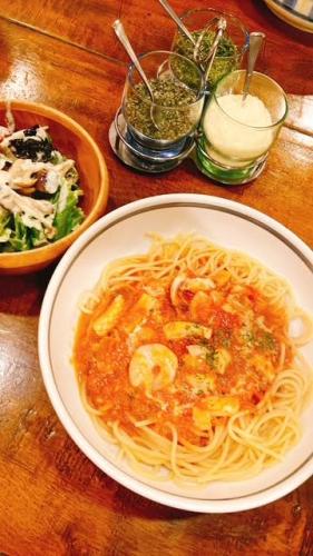 唐辛子トマトソースのパスタと、キノコサラダのセットです。
